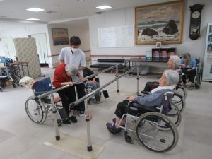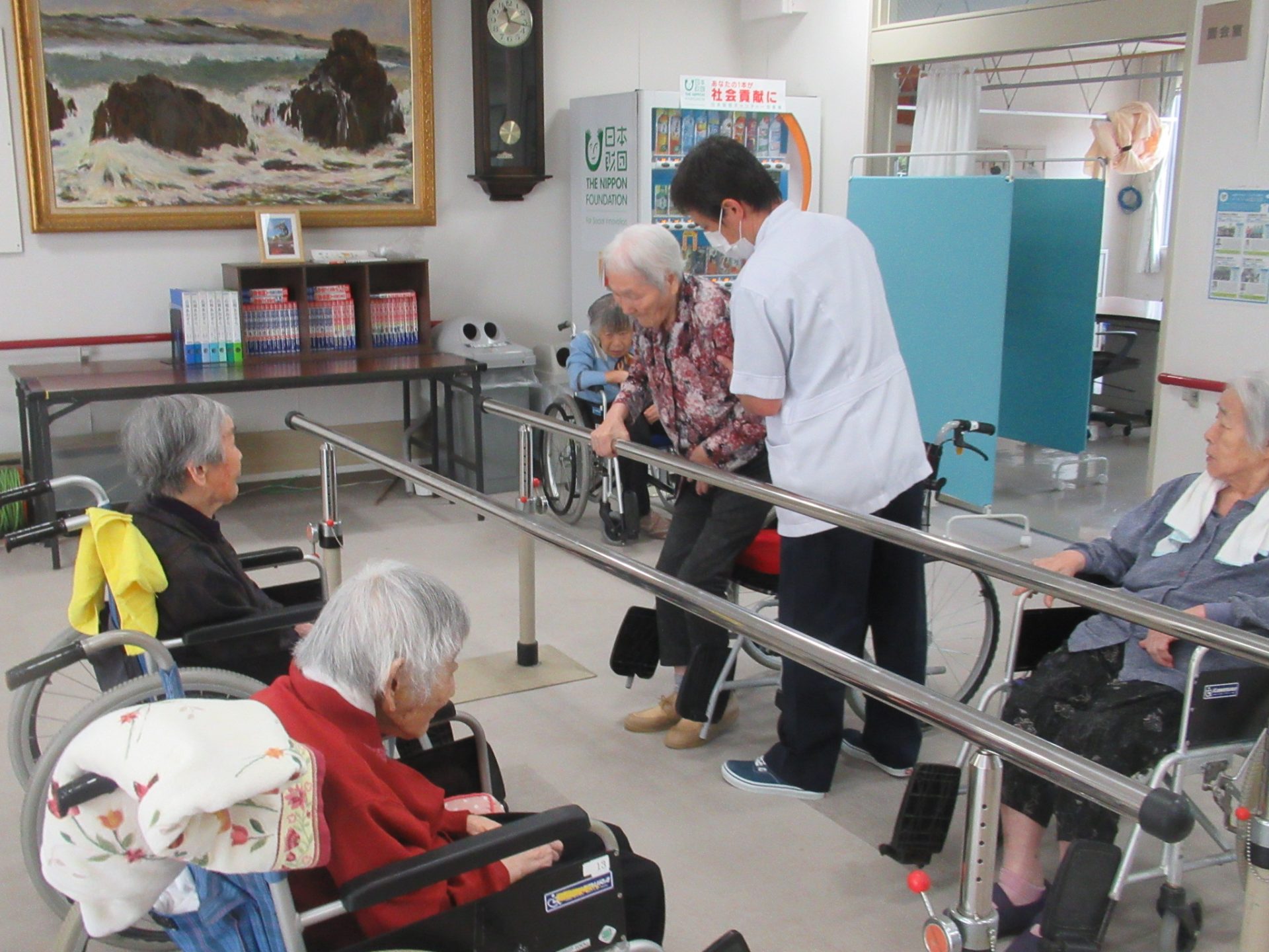 令和6年10月26日(土)毎週土曜日には、理学療法士の先生をお招きし、歩行、立ち上がり、ストレッチ等、ご利用者様の体に合わせたリハビリを実施しています。入所し改善された方も多くいらっしゃいます、歳には勝てないのではなく、「やればできる」の精神で皆様の気持ちを奮い立たせ、寝たきりの人は座れるように、座れる人は立てるように、少しでもご自分でできる事を増やせていければと考えています。理学療法士の両先生にはいつも感謝、感謝です。