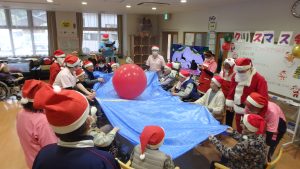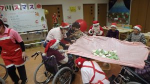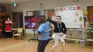 サンタさんが一人一人にプレゼントを手渡しした後、利用者の方々とレクリェーションを楽しみ、職員のいなかっぺ大将の歌に惹かれ白鳥が降り立ち優雅な舞を披露し大盛況でした。最後にクリスマスソングとお正月を合唱し、楽しいひと時を過ごしていただきました。