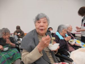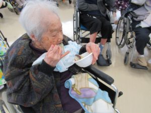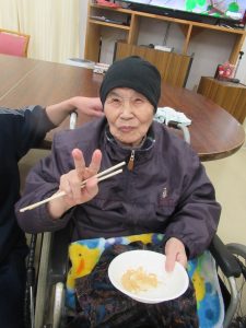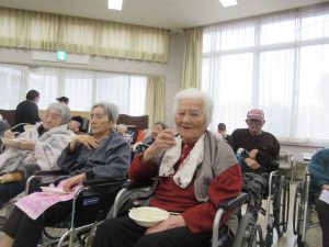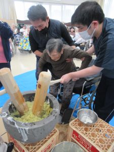 令和6年12月28日 毎年恒例の「もちつき大会」が青山荘、春風荘合同で開催されました。本格的に臼を用意し、皆様の前でご利用者様の掛け声にに合わせて「よいしょ、よいしょ」と餅をつき上げていきました。観戦していたご利用者様も昔取った杵柄なのか「私もつくばい」と日頃立てない方も、両脇を抱えながらも立ち上がり、杵を手に取りエンヤコリャ。最後は美味しい芋餅を口いっぱい頬張り、至福のお顔をされてました。今年一年もこれで終わりです。ご利用者様、ご家族様、地域の皆様、本当にお世話になりました、来年も良い年になるよう願ってます。