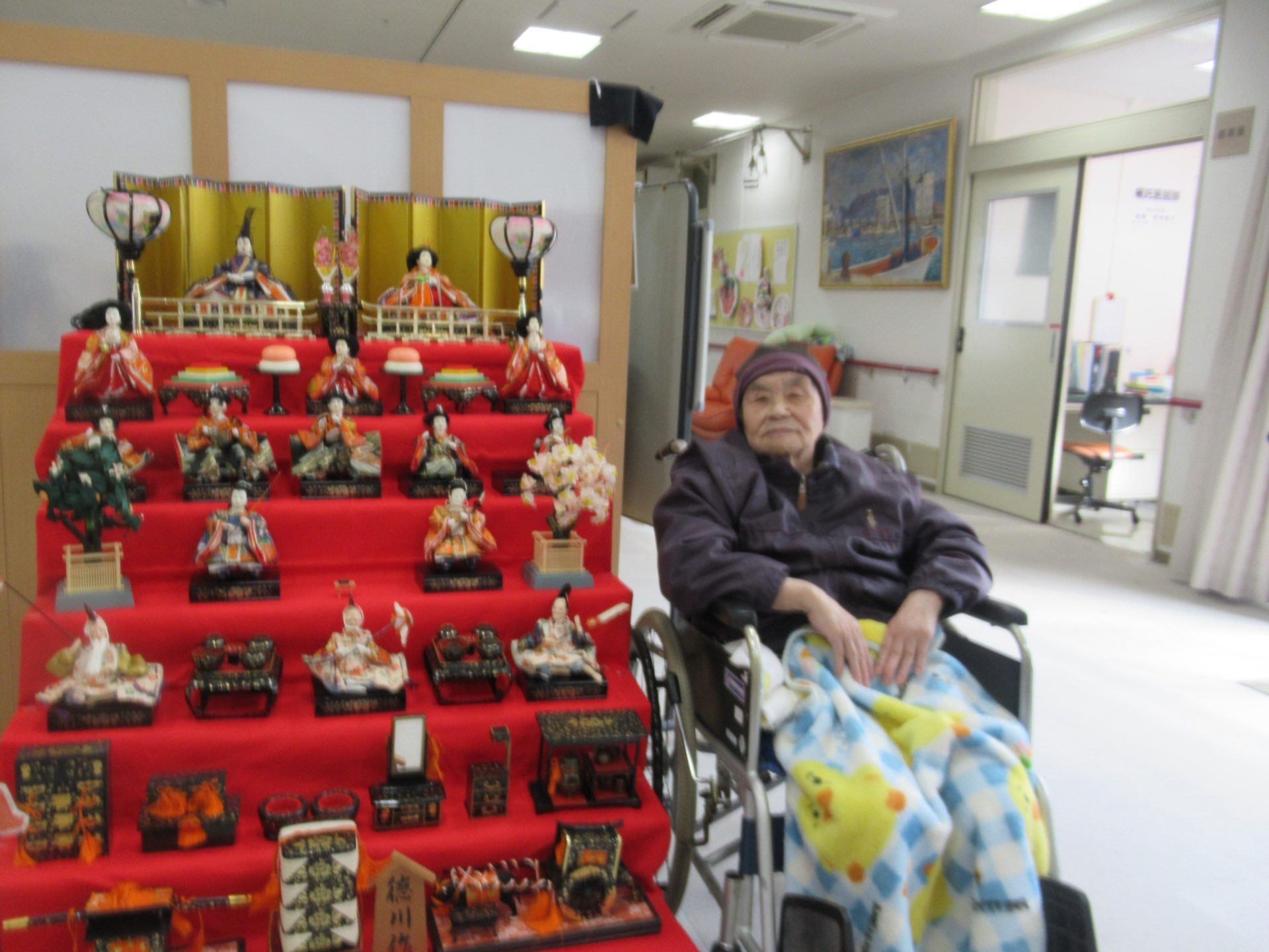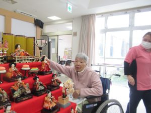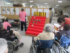 令和7年2月18日 2月中旬に入りまだまだ寒い日が続いてますが、春はそこまで来ています。3月の季節を象徴する「ひな人形」の設置をご利用者様と共に行いました。ご利用者様は「きれかね~」「なつかしかね~」と昔話を楽しみながら設置していきました。出来上がった時には満足そうに記念写真を撮られ、「早~暖かくなれば良いね」としみじみと言われてました。