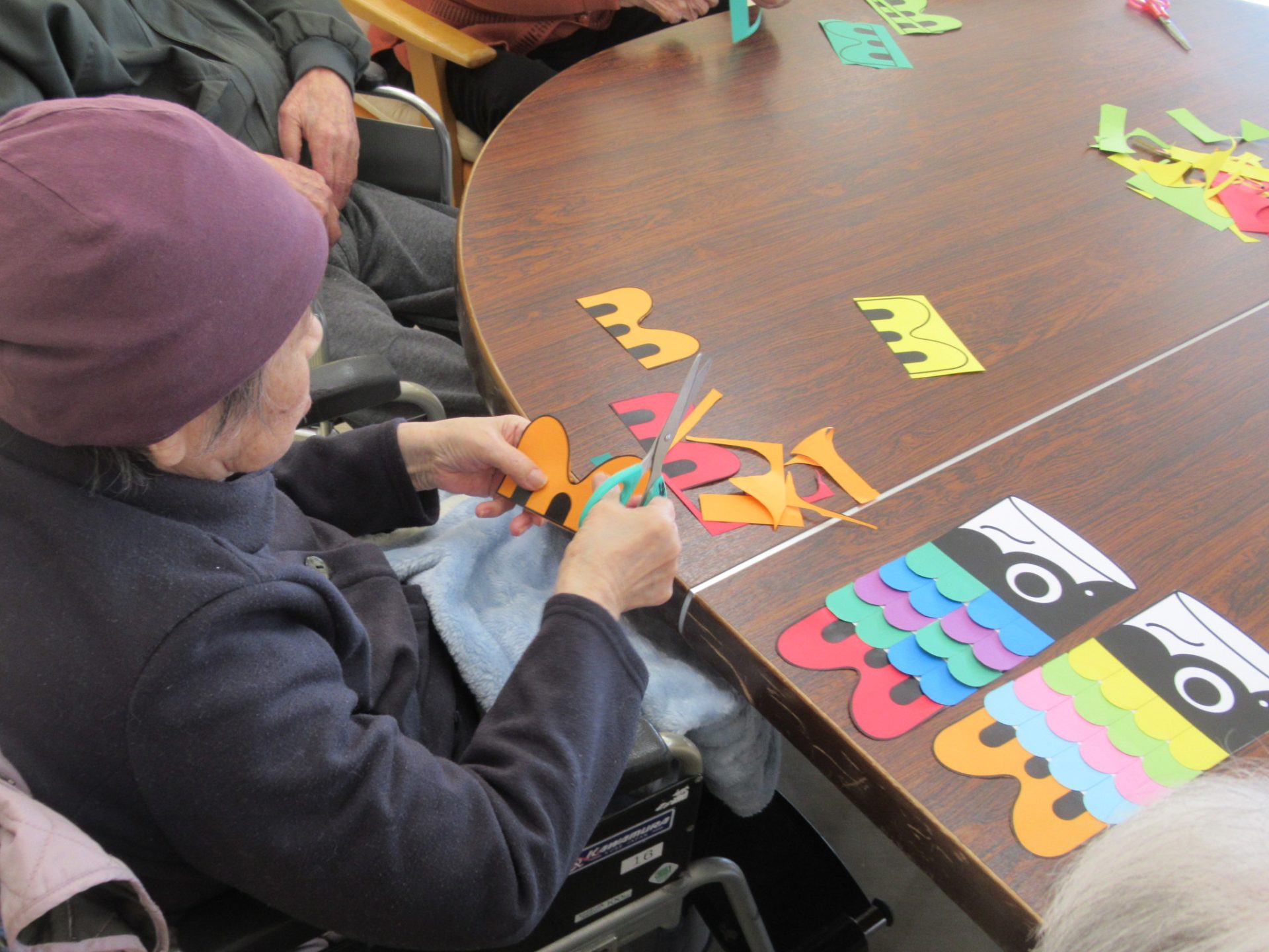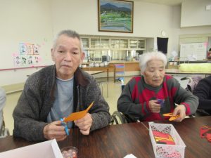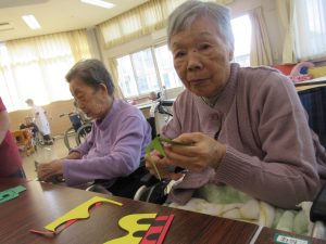 令和7年4月中旬以降から、ご利用者様にご協力により「こいのぼり」制作を始めました。最初は「難しいから無理ですよ」と言われいた皆様も、制作中は無言で楽しいそうに作っていました。出来上がりは、かわいいこいのぼり、壁に張り出し「5月やね~」と嬉しそうにされていました。何かに集中する事は大切で頭の体操、手の運動もかね良い手作業になったのでは、と感じています。