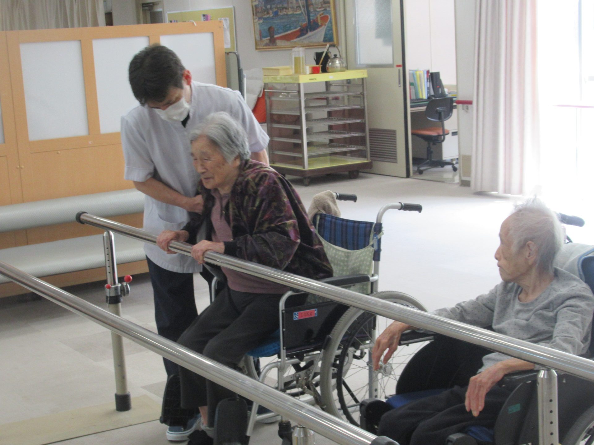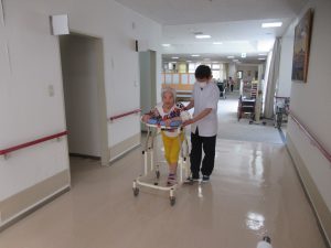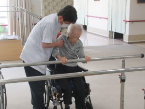 当施設では、毎週土曜日に理学療法士の先生をお呼びし、リハビリ指導を行って頂いております。通常は、介護員等が行う、生活リハビリが中心ですが、その方々の適性をキチンと把握し、維持、レベルアップを安全に行うために実施しています。寝たきりの方ならば座れるように、座れる方は立てるように、生活の中で自分自身で出来る事を増やして頂き、少しでも豊かな生活を送って頂くよう努めています。