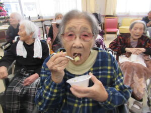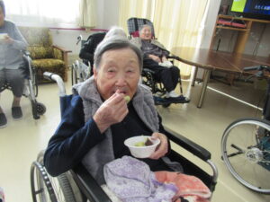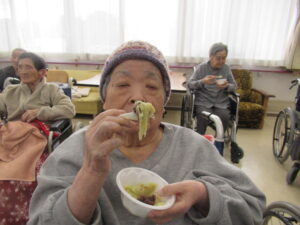 ご利用者様には、きな粉餅と芋餅が振舞われました。芋餅は特に人気があり、おかわり