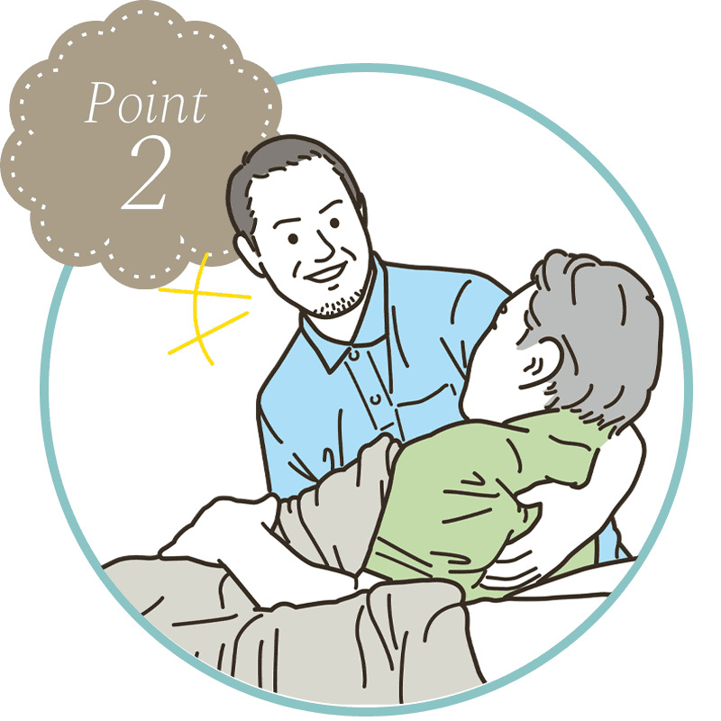※「看取り介護」とは、「終焉の時を穏やかな気持ちで過ごせるように」施設での看取りは、医師により医学的に回復の見込みがないと判断された時に、最後の場所選びについて、ご利用者の意志並びにご家族の意向を最大限に尊重して行われるサービスです。また、施設での看取りでは医師、看護師、介護士協力のもと、身体的及び精神的苦痛を緩和し、可能な限り尊厳を保ち、安らかな終末を迎えられるようケアに努めております。