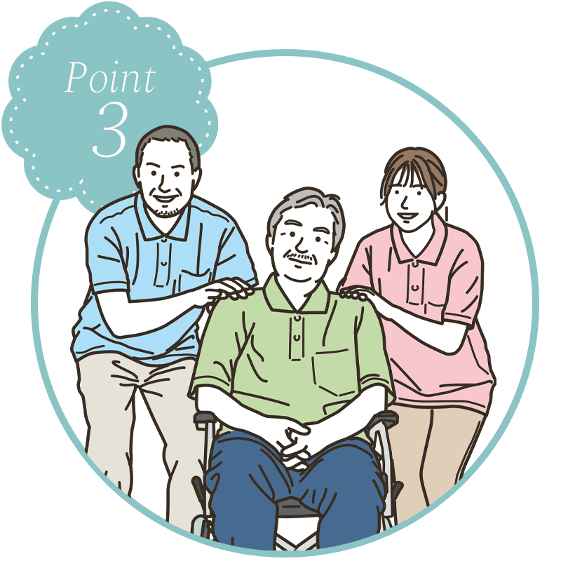 ご入利用様へは、「笑顔で過ごせる安心できる生活空間」を提供できる支援を目指し、他職種連携(チームケア)にて実施しております。